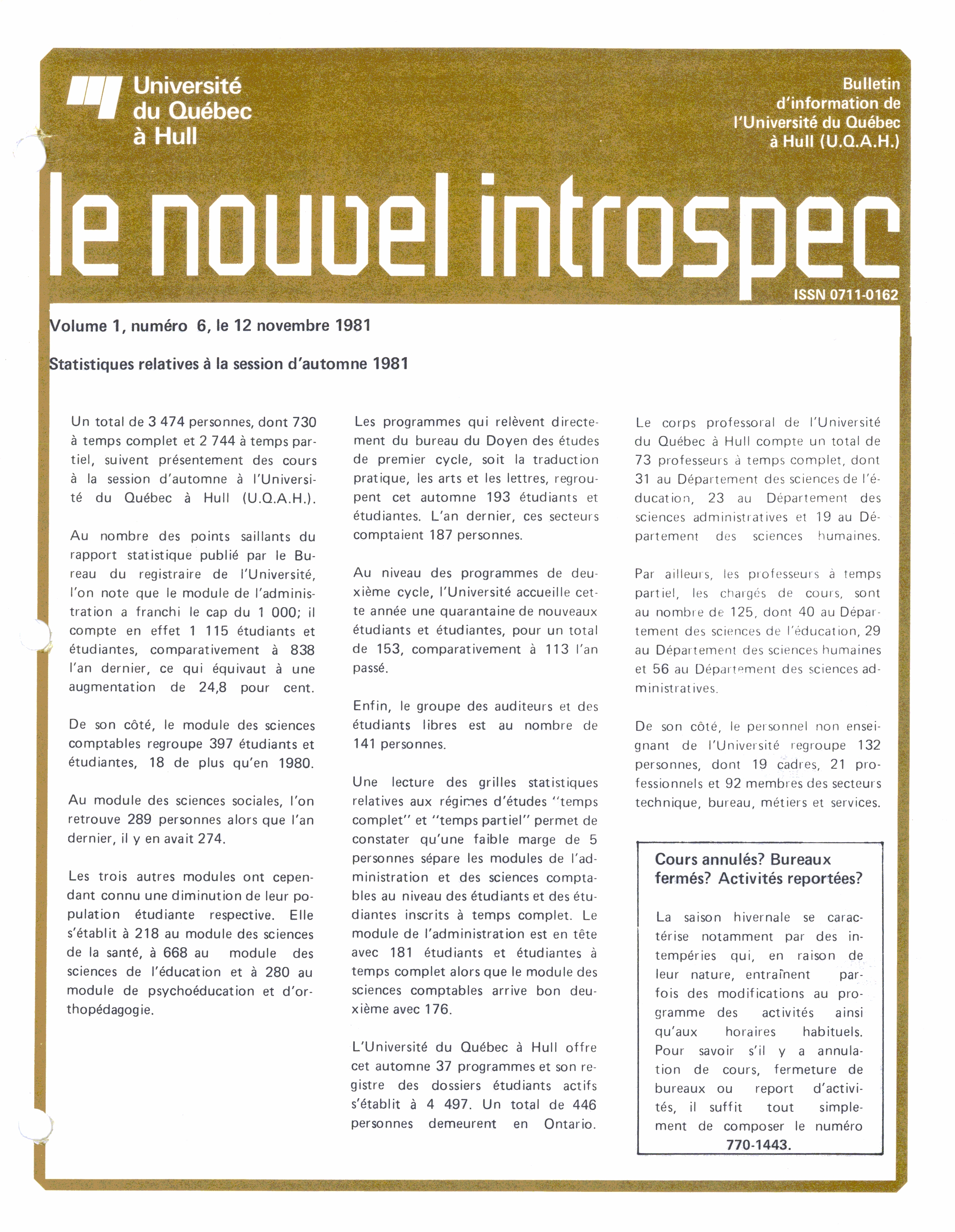 Une présence grandissanteCroissance soutenue et développement rigoureux sont l’apanage des années qui suivent. L’UQAH diversifie l’offre et consolide ses actions en termes d’études avancées et de recherche et, au cours des années 1980, ajoute deux programmes d’études de deuxième cycle aux cinq qu’elle offre déjà et se distingue par sa maîtrise en relations industrielles, qui fait d’elle la première constituante de l’UQ à offrir une telle formation. Elle adhère au programme de doctorat en éducation offert en réseau par l’UQ et se démarque en lançant un programme de baccalauréat en informatique. Elle devient ainsi la seule université francophone à offrir une telle formation dans la région. En juin 1981, l'UQAH c'est :