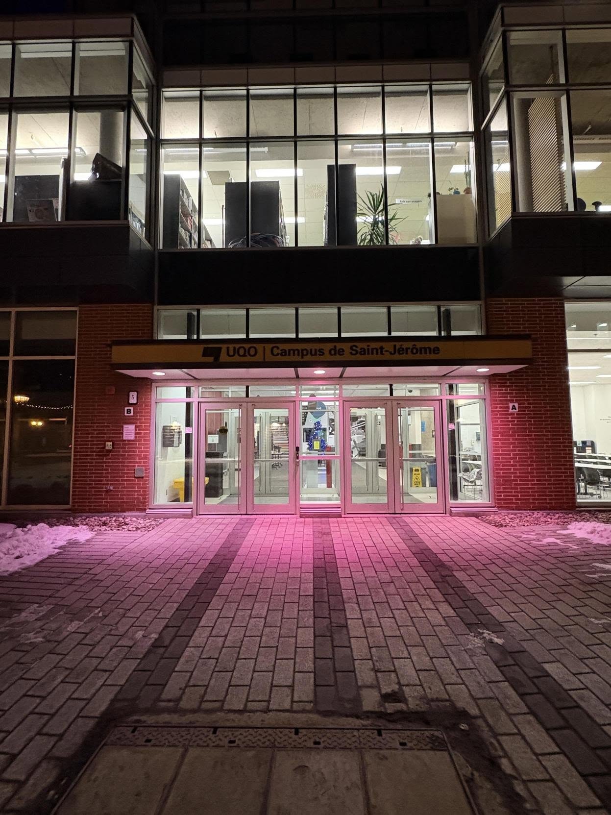 Du 25 novembre au 6 décembre 2025, l’UQO souligne les 12 jours d’action contre les violences faites aux femmes avec des activités de sensibilisation et de prévention. Pour la première fois, les entrées des campus de Gatineau (pavillon Alexandre-Taché) et de Saint-Jérôme seront illuminées de rose, symbole de soutien, de solidarité et d’engagement envers toutes les personnes victimes de violences, tout en rendant hommage aux 14 femmes assassinées lors de la tragédie de Polytechnique en 1989.