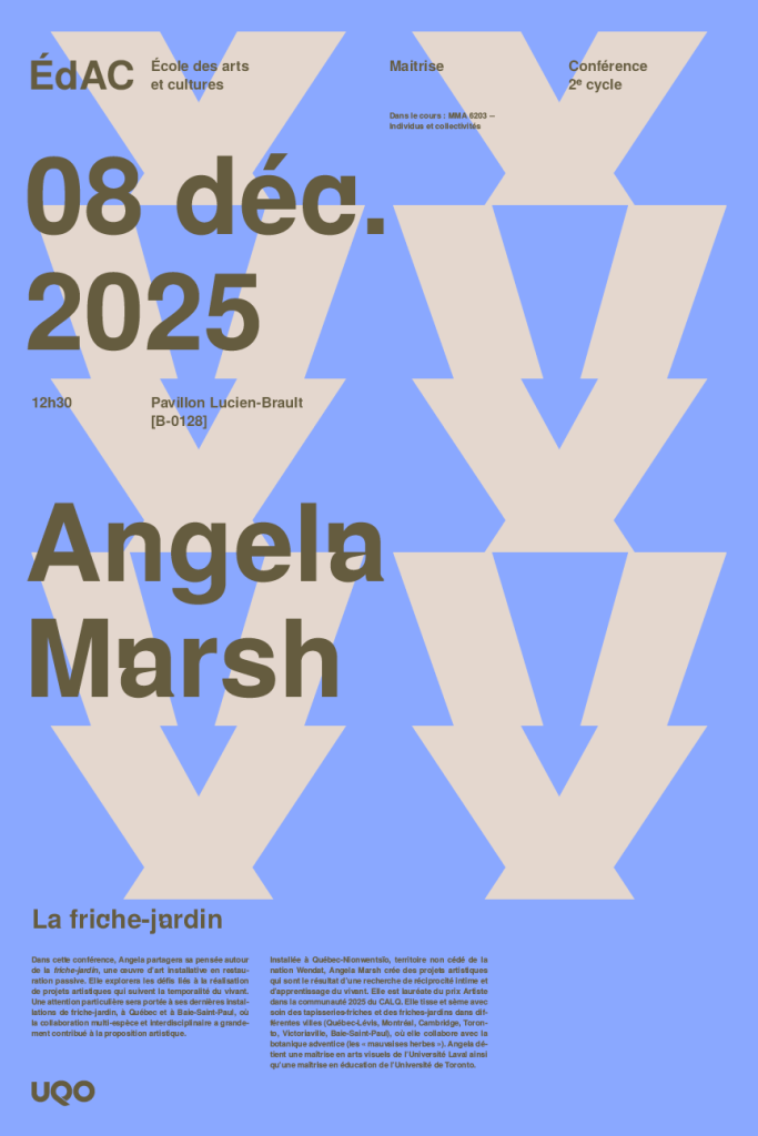 Dans cette conférence, Angela partagera sa pensée autour de la friche-jardin, une œuvre d’art installative en restauration passive. Elle explorera les défis liés à la réalisation de projets artistiques qui suivent la temporalité du vivant. Une attention particulière sera portée à ses dernières installations de friche-jardin, à Québec et à Baie-Saint-Paul, où la collaboration multi-espèce et interdisciplinaire a grandement contribué à la proposition artistique.