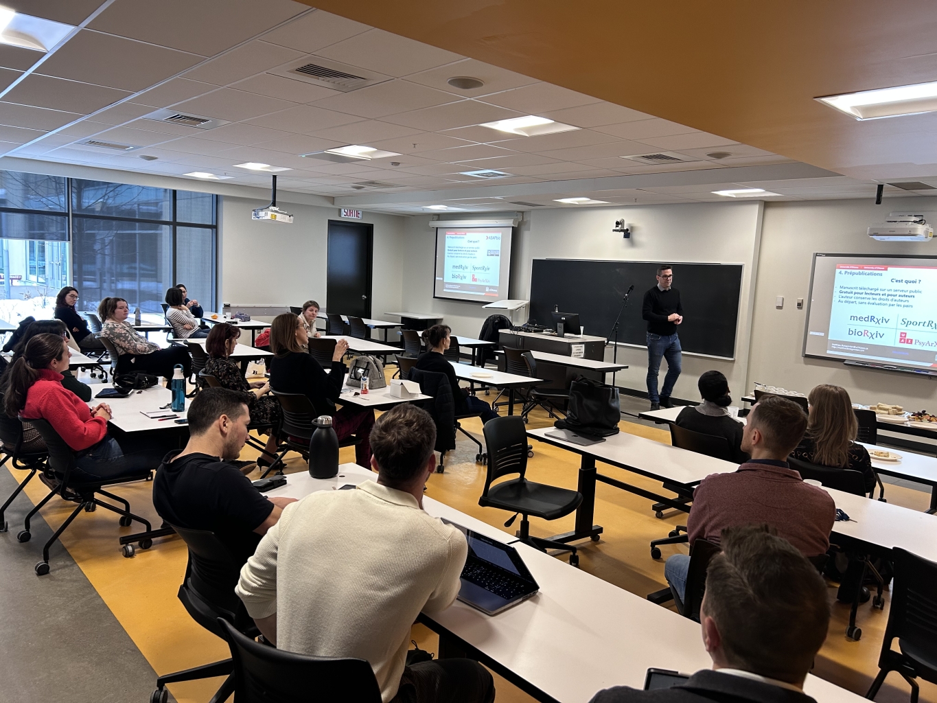 Le mercredi 17 janvier, l'équipe de recherche MOSAIC (MOuvement, SAnté, Interdisciplinarité et Comportement) a inauguré le lancement de ses activités en tenant, avec succès, sa première conférence. Il s'agissait d'un Midi-MOSAIC qui mettait en vedette une présentation faite par le Professeur Matthieu Boisgontier de l'Université d'Ottawa. Ayant le désir d'innover en matière de recherche en santé afin de mieux servir la communauté de l'Outaouais et du Québec, la conférence à amener les personnes présentes à discuter des piliers fondamentaux de la science ouverte, soit la transparence, la réplicabilité, la qualité et l'accessibilité de la recherche. Près d'une trentaine de personnes étaient présentes (étudiants, professeurs, chercheurs de l'UQO et du CISSS de l'Outaouais), ce qui reflète parfaitement l'une des missions centrales de l'équipe MOSAIC, soit de favoriser le transfert des connaissances en santé et la formation interdisciplinaire de la relève en recherche sur l'activité physique.