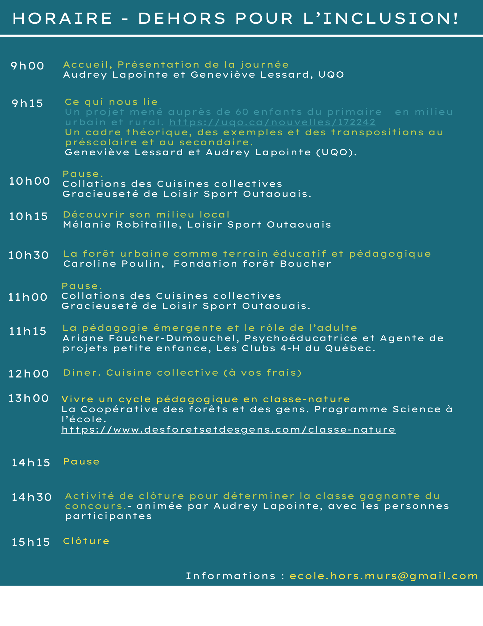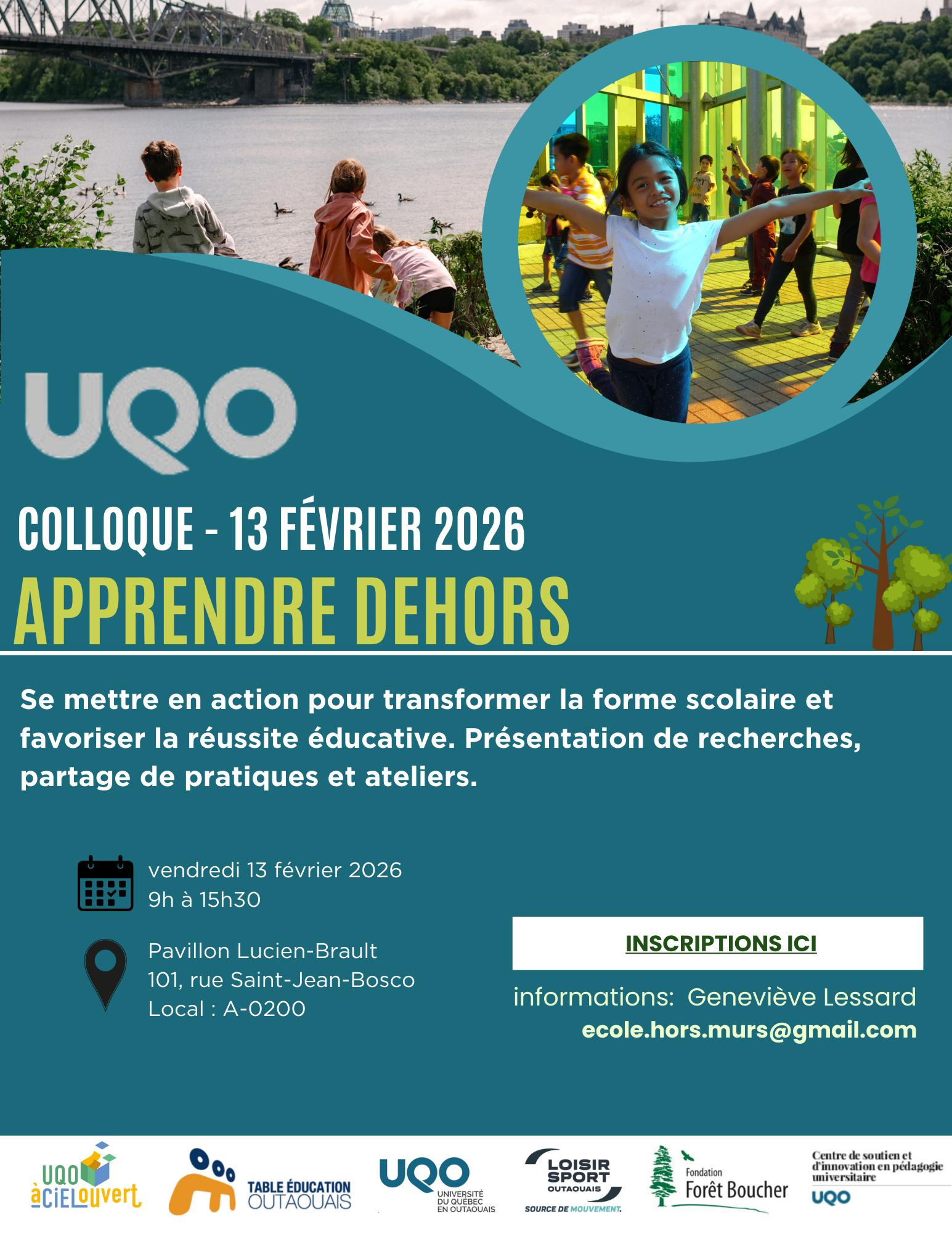 Il y aura présentation de recherches, partage de pratiques, présences d’exposants (Clubs 4-H, Ex3 de Loisir Sport Outaouais, La fondation de la forêt Boucher) et la voix des enfants portée par le concours Tu vas dehors avec ton prof.
