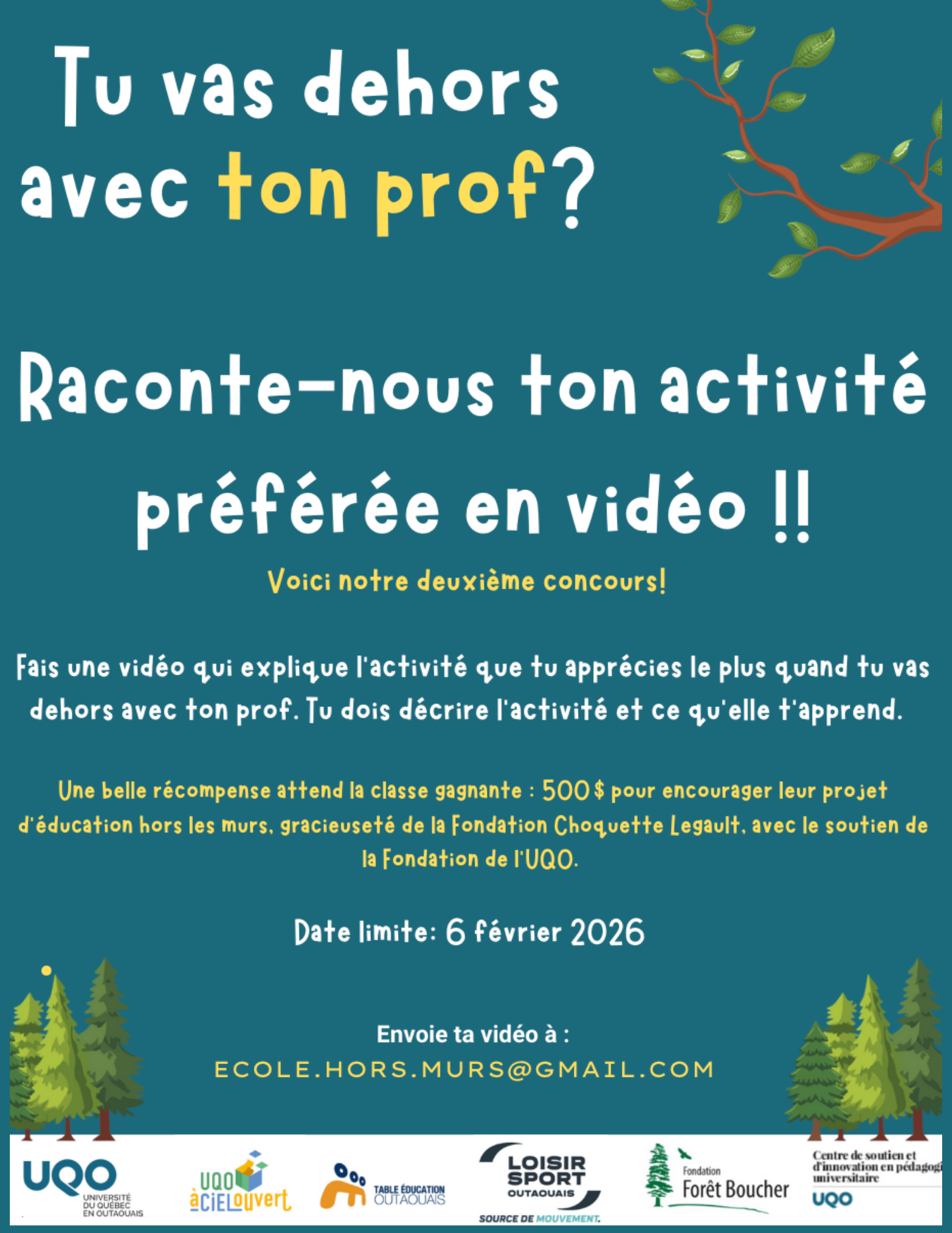 Ce projet initié par la professeure Lessard et lancé officiellement en juin 2024 a permis de conclure des partenariats pour différents projets entre l’UQO, la Fondation forêt Boucher et Loisir sport Outaouais ainsi qu’avec la Table Éducation Outaouais et des écoles.