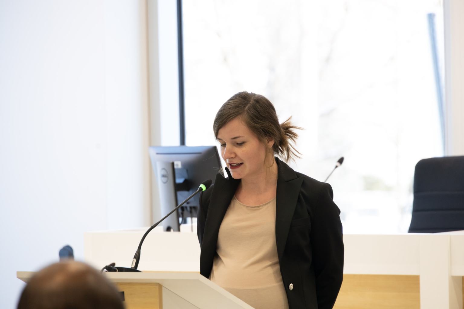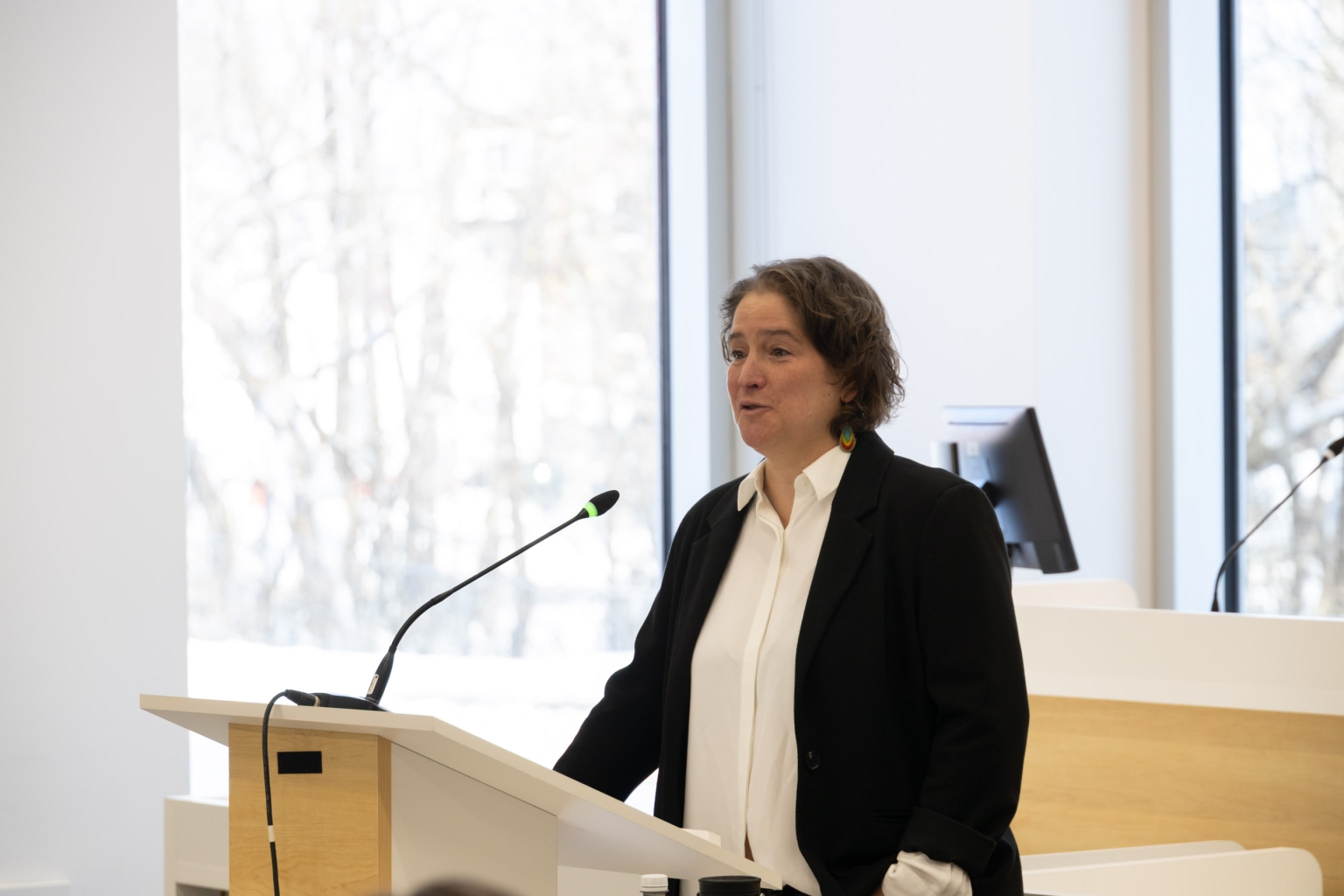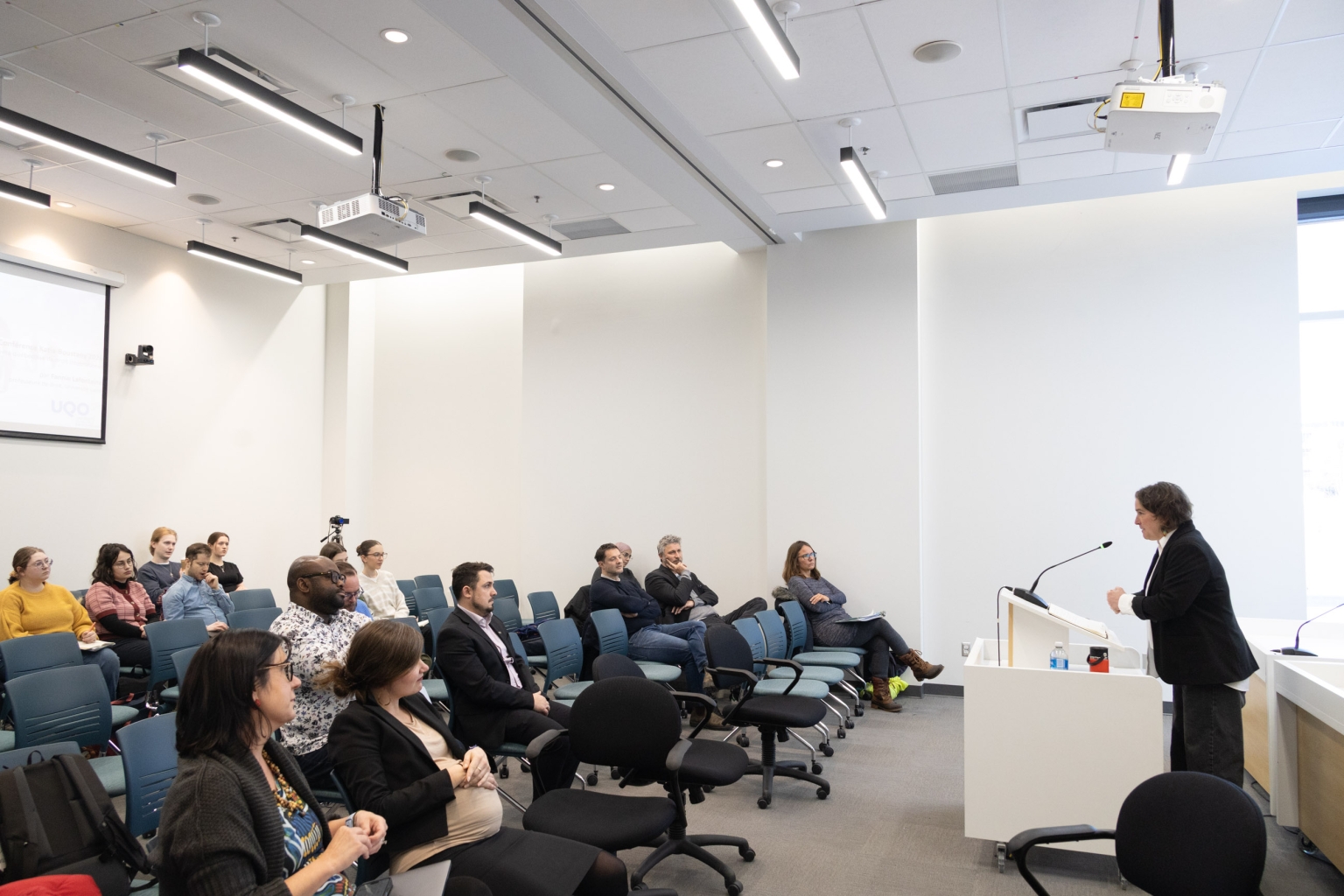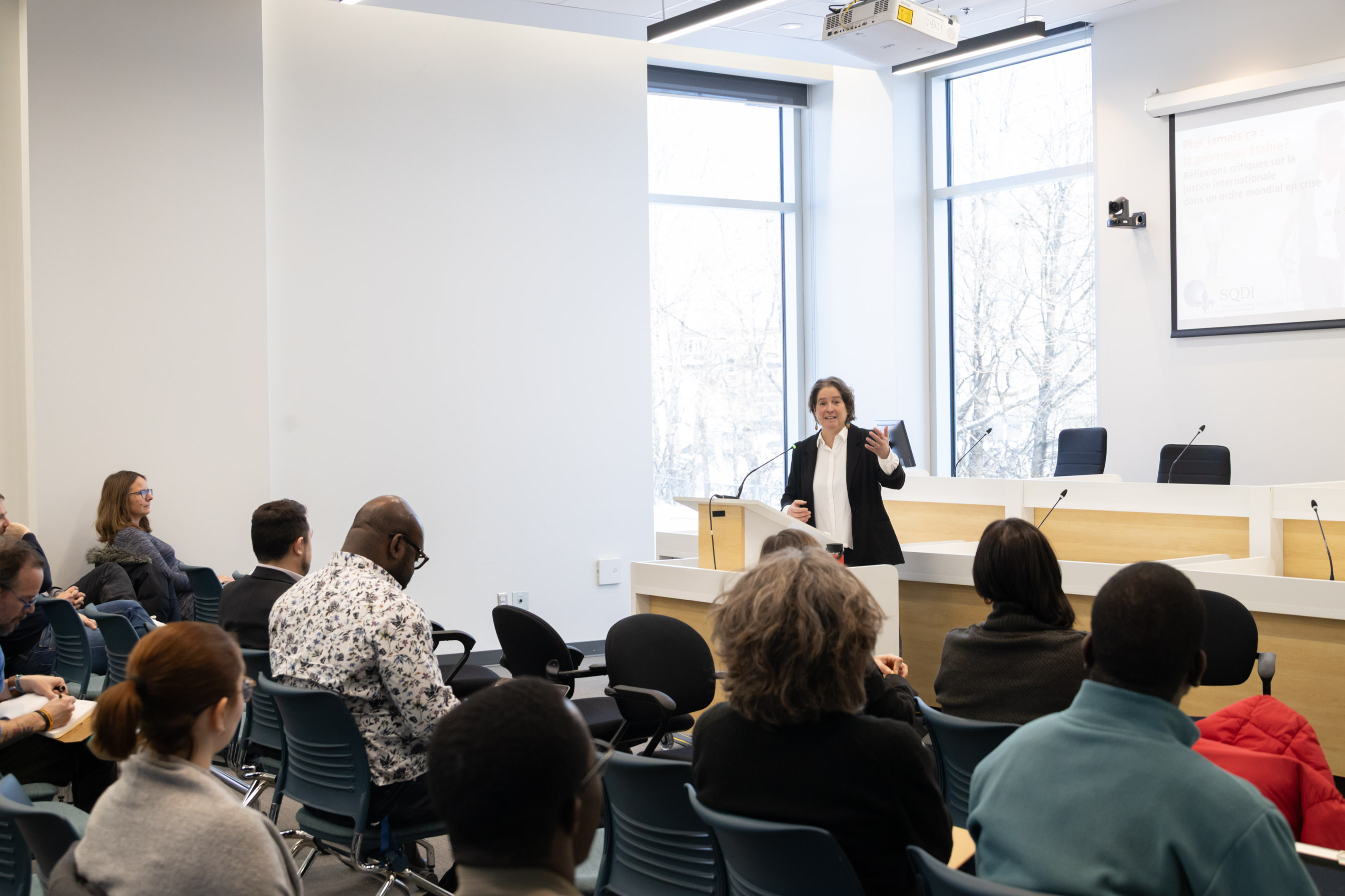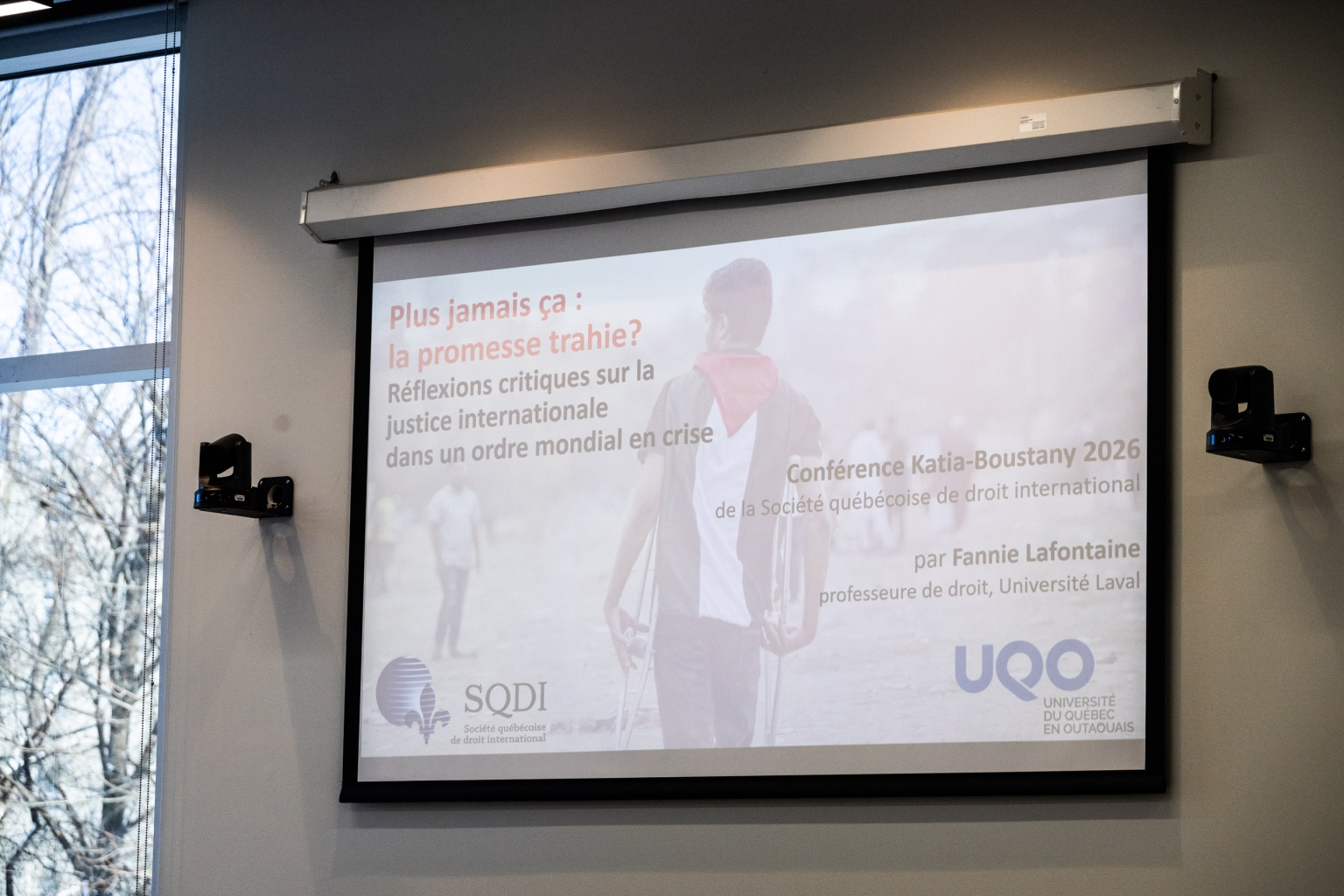 La conférencière-invitée, Fannie Lafontaine, professeure à la Faculté de droit de l’Université Laval, a abordé le thème Plus jamais ça: la promesse trahie? Réflexions critiques sur la justice internationale dans un ordre mondial en crise. L'évènement s'est tenue dans tribunal-école au pavillon Alexandre-Taché, à Gatineau.