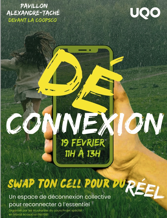 Les étudiantes du cours ENV-1081 - Projet spécial en travail écosocial, offert dans le cadre de la Formation écocitoyenne UQO, organisent un événement le 19 février prochain (11h à 13h), devant la Coopsco au pavillon Alexandre-Taché, pour revendiquer les droits des personnes étudiantes à la déconnexion numérique et à la (re)connexion humaine.