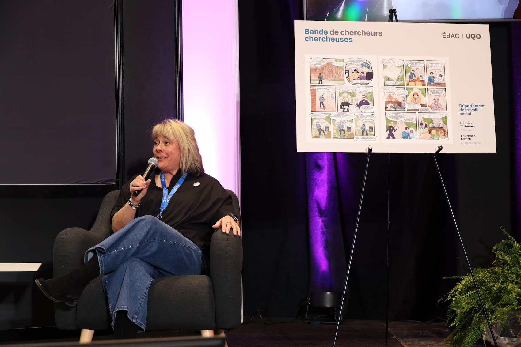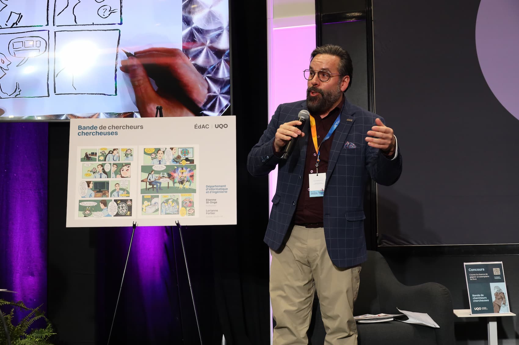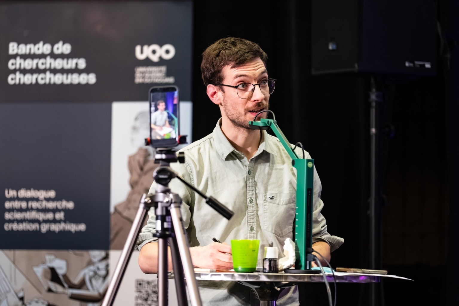 Le doyen de la recherche et de la création à l’UQO, Simon Beaudry, a animé le lancement, le jeudi 19 février 2026, pendant que professeur Andrieu de Lévis a pris le crayon et dessiné en direct au grand plaisir des gens présents. Monsieur Beaudry a également animé un échange avec la professeure au Département de travail social de l’UQO, Nathalie St-Amour, dont les travaux se retrouvent dans la BD, et Laurence Girard, l’étudiante de l’ÉdAC qui a réalisé la planche.