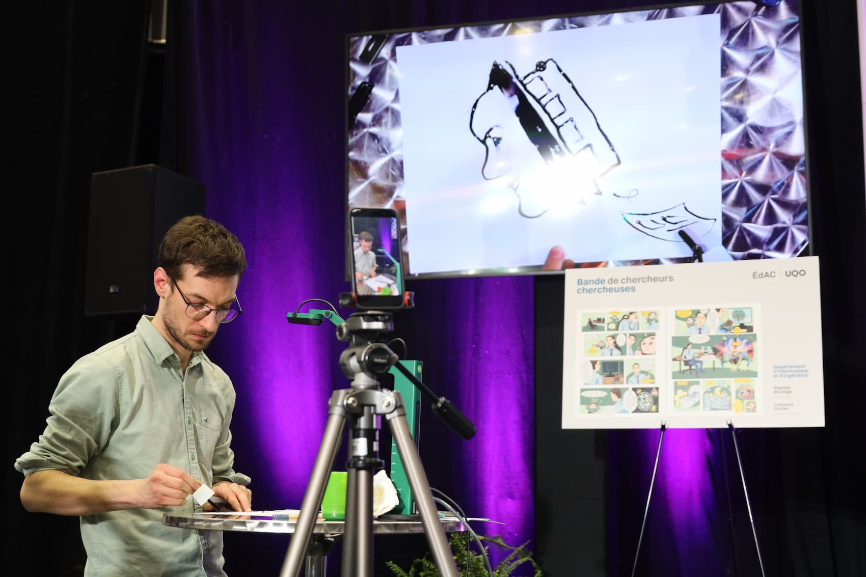 Le professeur et bédéiste de l'École des arts et cultures, Jean-Charles Andrieu de Lévis, a dessiné en direct lors du lancement au Salon du livre de l'Outaouais, le 19 février 2026, au Palais des congrès de Gatineau.