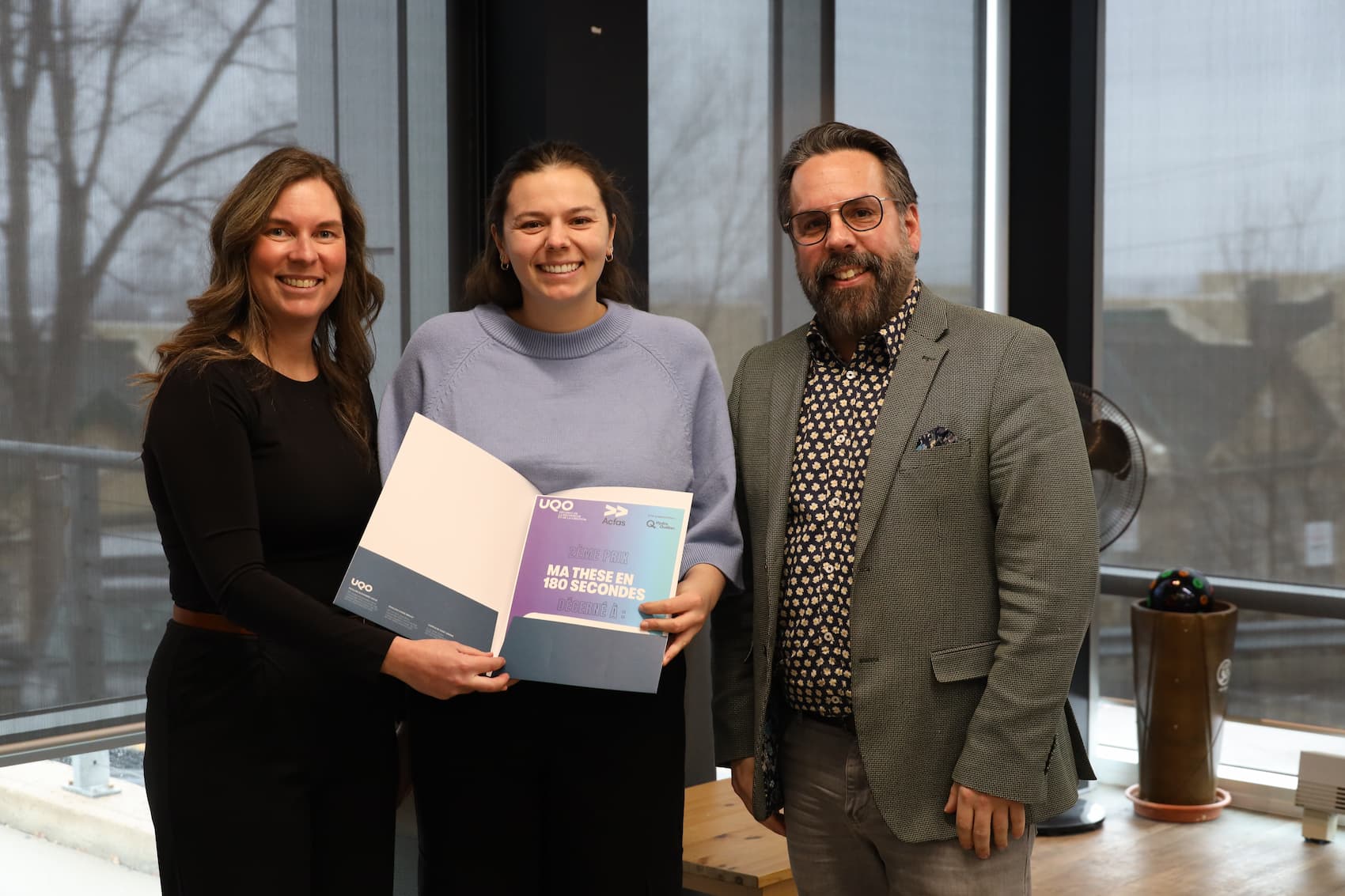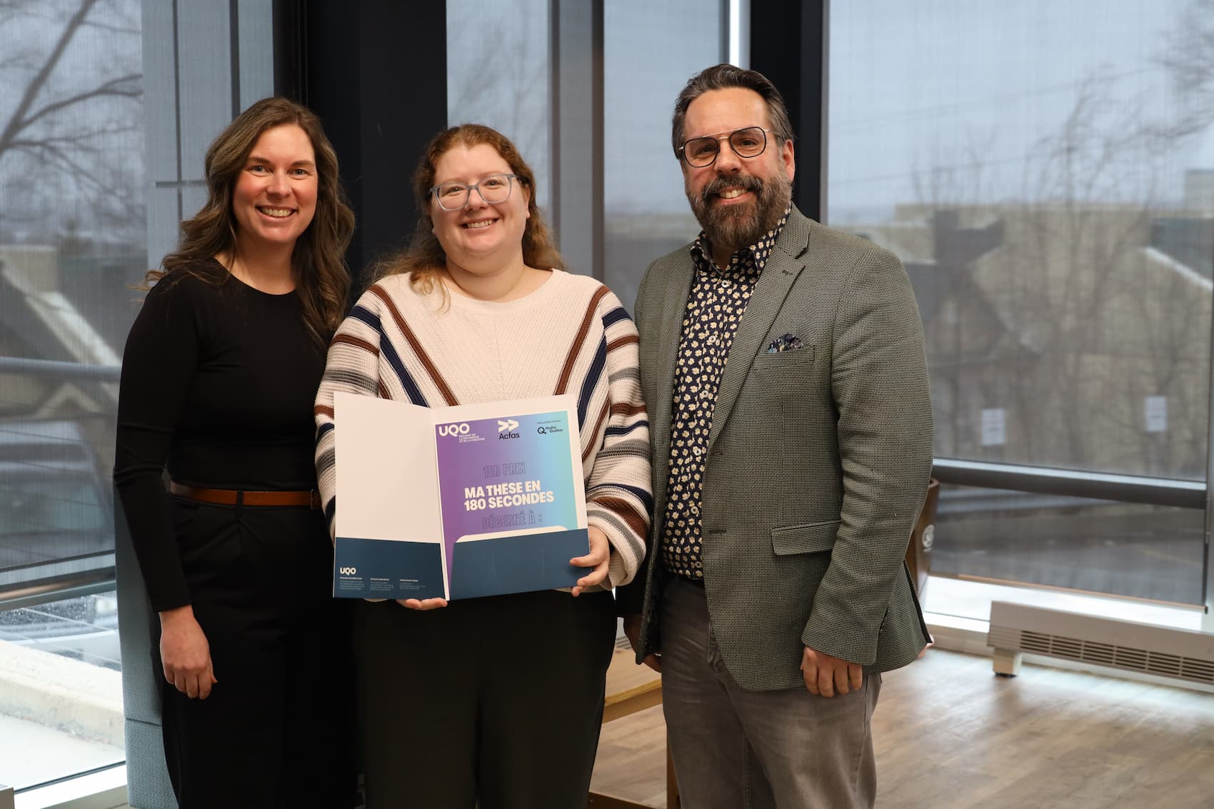 Arianne Richer, deuxième prix au concours MT 180 à l'UQO, en compagnie de l'organisatrice Sarah Mehenni, coordonnatrice à la gestion de la recherche au Décanat de la recherche et de la création, et du doyen Simon Beaudry.