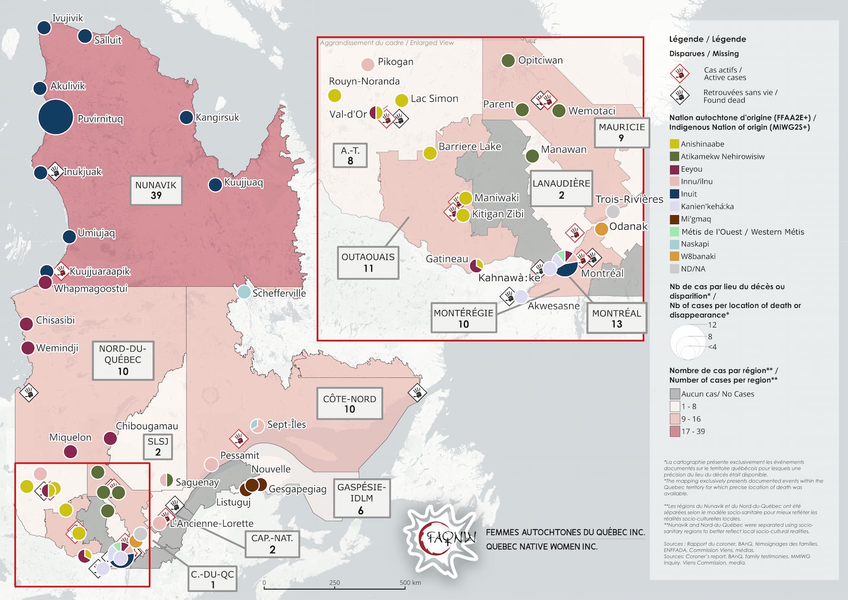 La carte montre que le phénomène touche plusieurs nations autochtones du Québec. Source : Femmes Autochtones du Québec