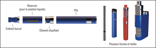 Les produits de vapotage (cigarettes électroniques ou e-cigarettes) sont des dispositifs à pile qui chauffent un liquide et