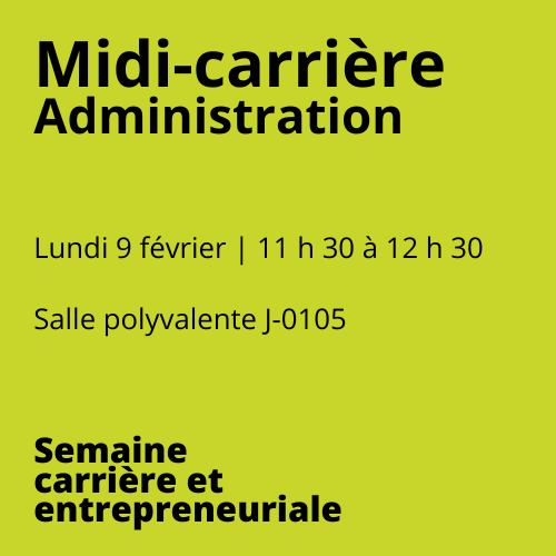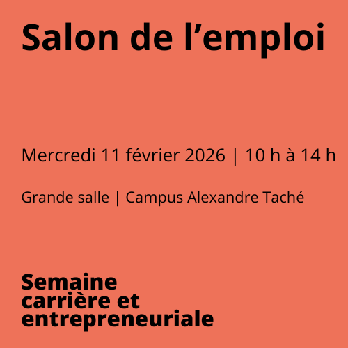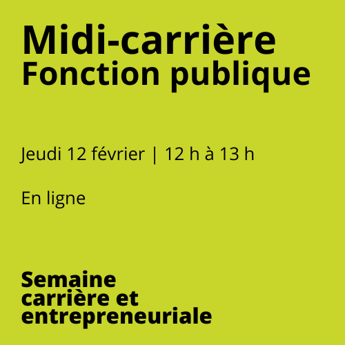 Tu rêves d'un emploi stimulant, stable et pour lequel tu peux réellement faire un changement? La fonction publique embauche pour différents postes dans plusieurs domaines. Que tu sois une personnes étudiantes ou diplômées, il y a une opportunité pour toi au gouvernement! Participe à cette séance d'information où on te présentera les emplois disponibles et un témoignage d'une ancienne personne étudiante embauchée à la fonction publique.