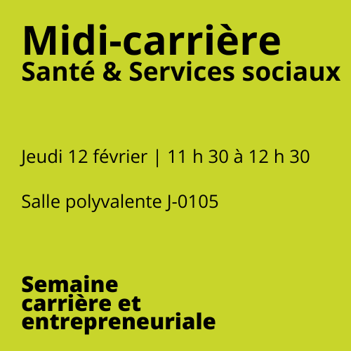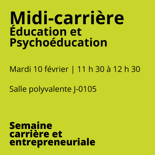 Le Centre de Service Scolaire de la Rivière-du-Nord (CSSRDN) et la ville de St-Colomban seront présents pour te présenter leurs opportunités de carrière au sein de leurs organisations. Ce sera l'occasion d'en apprendre davantage sur les postes en éducation et psychoéducation, ainsi que dans d'autres domaines, de pouvoir poser tes questions et rencontrer les recruteurs. Apporte ton CV et viens luncher avec ton futur employeur!