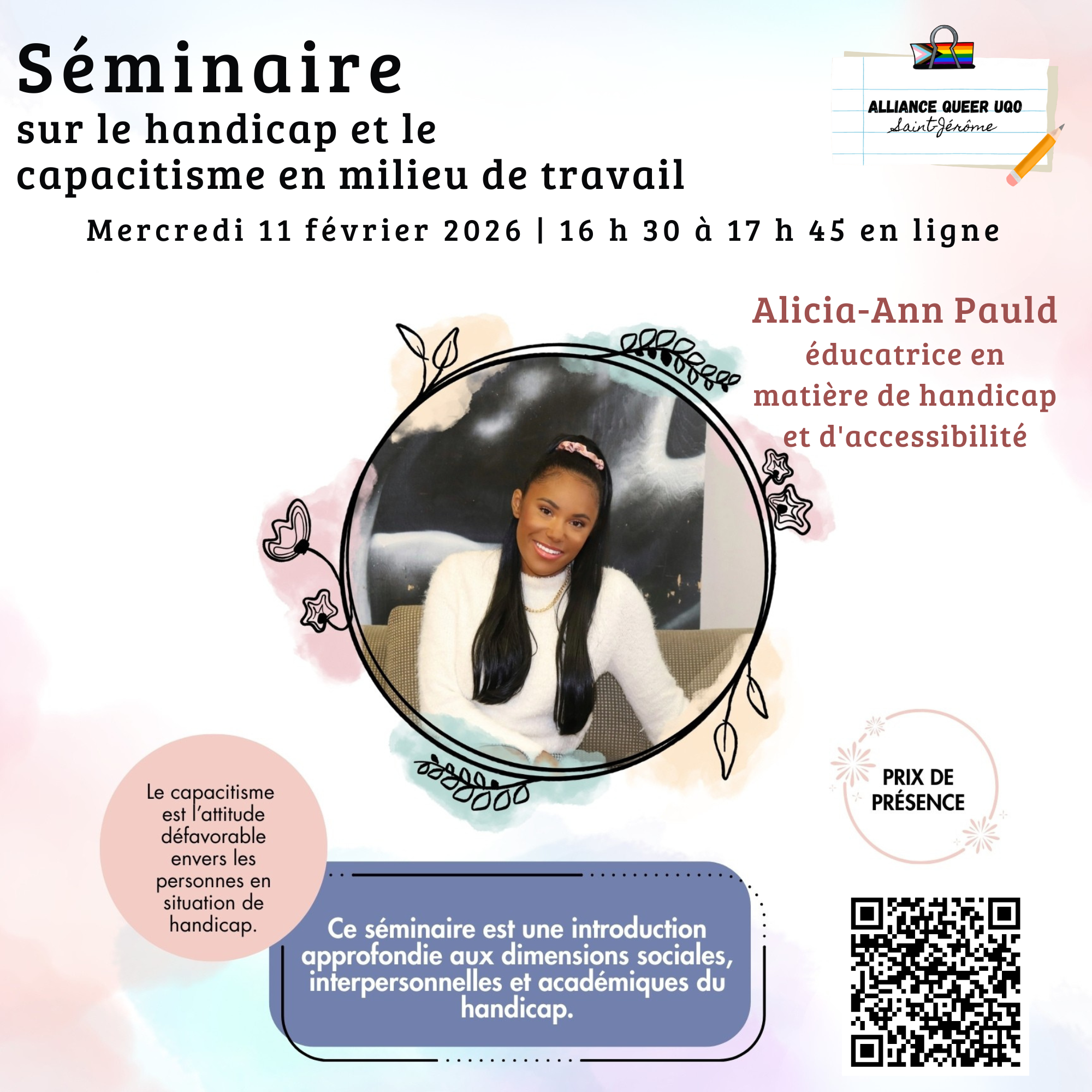 Le capacitisme, cette attitude défavorable envers les personnes en situation de handicap, est malheureusement très présent dans notre société. Ce séminaire est donc une introduction approfondie aux dimensions sociales, interpersonnelles et académiques du handicap. Viens en apprendre plus sur le sujet et deviens un∙e meilleur∙e allié∙e au quotidien et dans ton milieu de travail.Il sera présenté par Alicia-Ann Pauld (elle), une éducatrice en matière de handicap et d'accessibilité.
