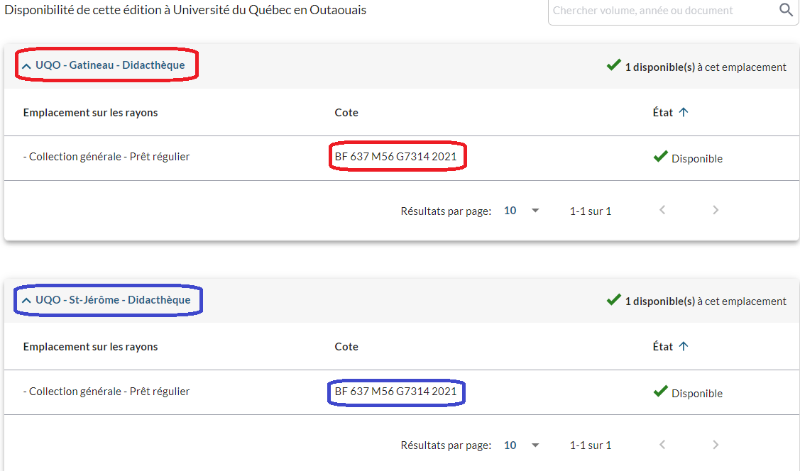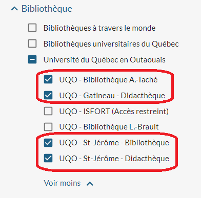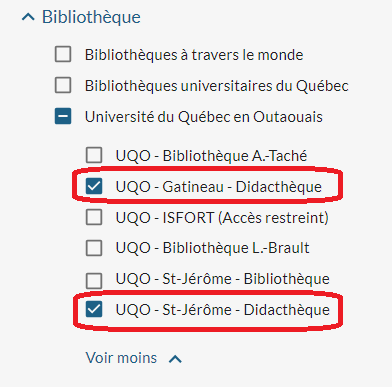 Pour trouver des livres jeunesse, ajoutez Ouvrages pour la jeunesse après le mot-clé inscrit dans la boîte de recherche. Il est également possible de limiter la recherche à la UQO - didacthèque (succursale de Gatineau) ou à UQO - Saint-Jérôme - Didacthèque.